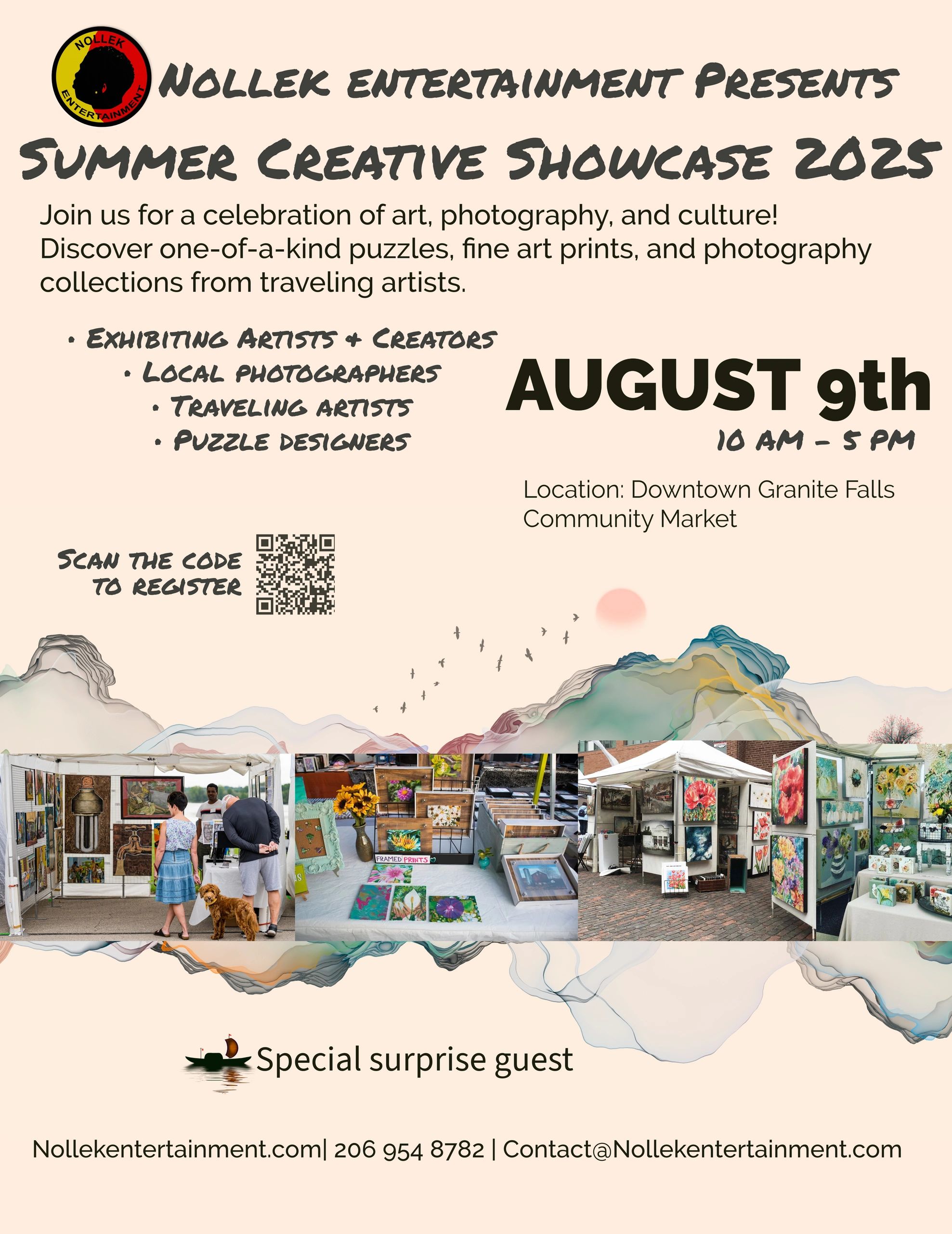 Step into a world of art, photography, and culture! Join us August 9th, 2025 from 10 AM – 5 PM at the Downtown Granite Falls Community Market for a vibrant celebration of creativity.